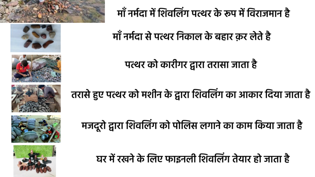 नर्मदेश्वर शिवलिंग नर्मदा नदी के तल मे निर्मित होते है ओर इन्हे कारीगरों द्वारा निकाल कर मशीनों से तरास कर शिवलिंग का अंडाकार रूप दिया जाता है| नर्मदा जी से निकले शिवलिंग पूर्ण तरह अंडाकार नहीं होते है इनको मशीनों से गोले ओर चिकना किया जाता है
